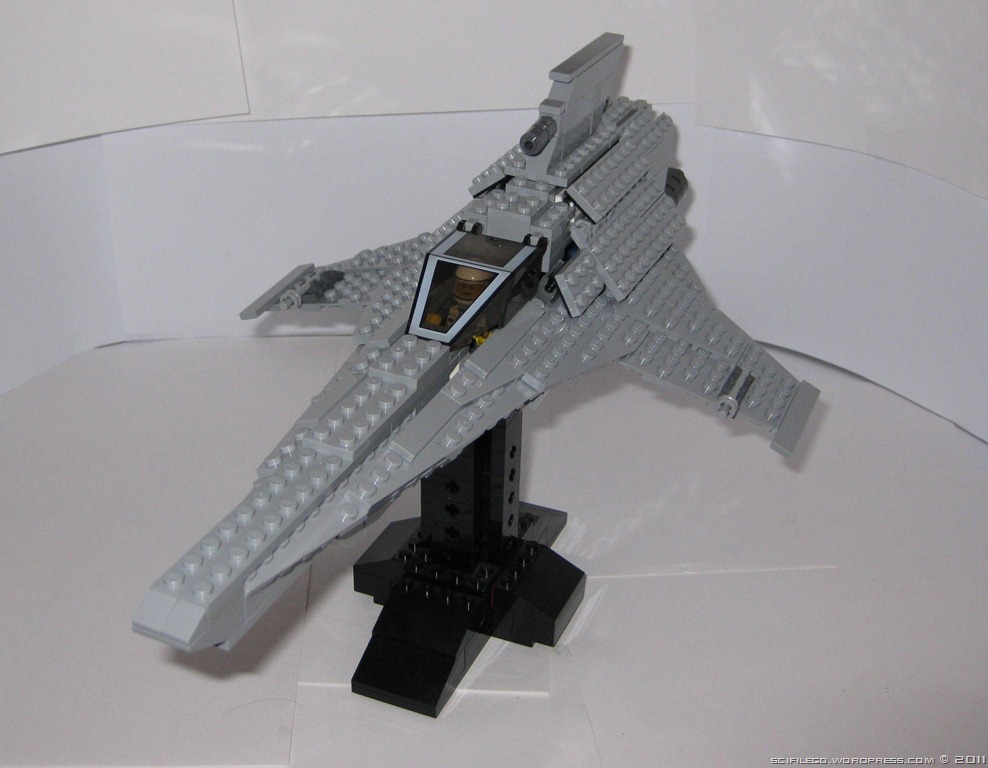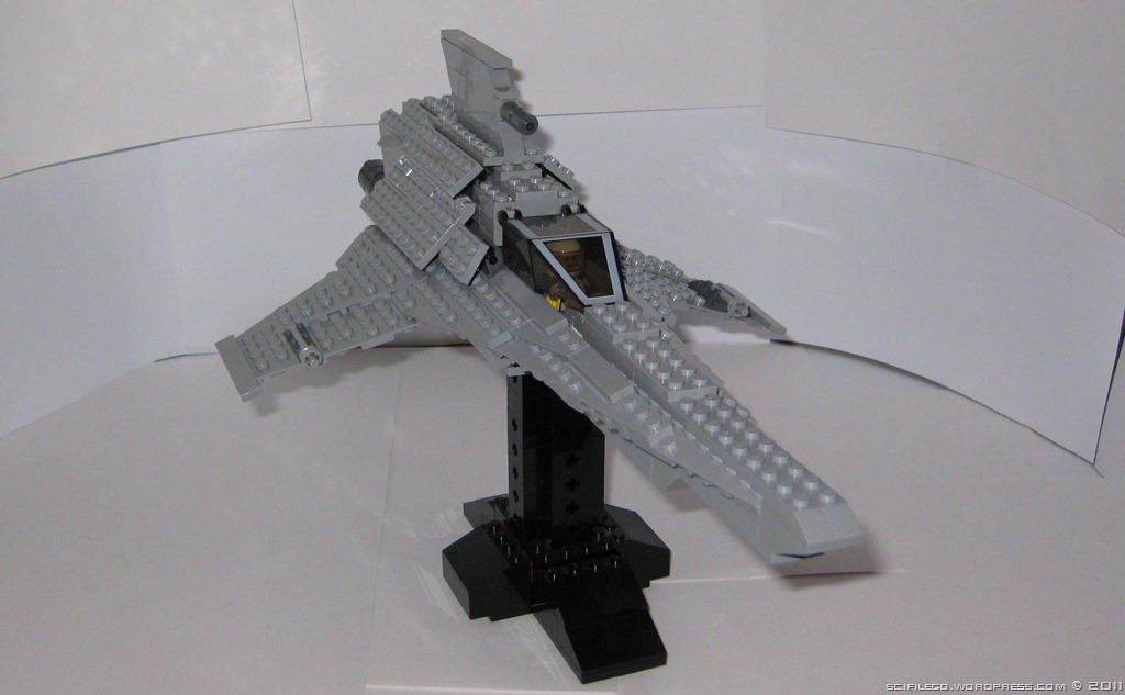 Here is my Mark VII Viper. It took a bit of work, but it is finally done. I did a lot of experimenting with the angle pieces. And I have some minifgs: Admiral Adama (without glasses), Lt Starbuck, Captain Apollo, and 2 pilots (Which were meant to be Apollo and Starbuck). I decided to make the pilots so I could put something in the cockpit of the Vipers.
